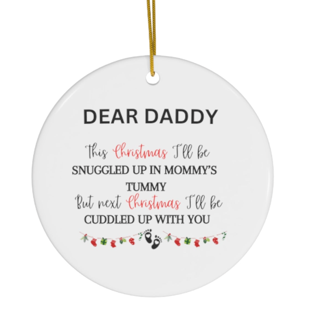 Crafted with love and anticipation, this exquisite ornament serves as a heartfelt token from your unborn child to their beloved daddy. Delicately designed, the ornament captures the essence of the precious moments yet to come, symbolizing the joy, warmth, and anticipation that fills the air as a new chapter of family unfolds.