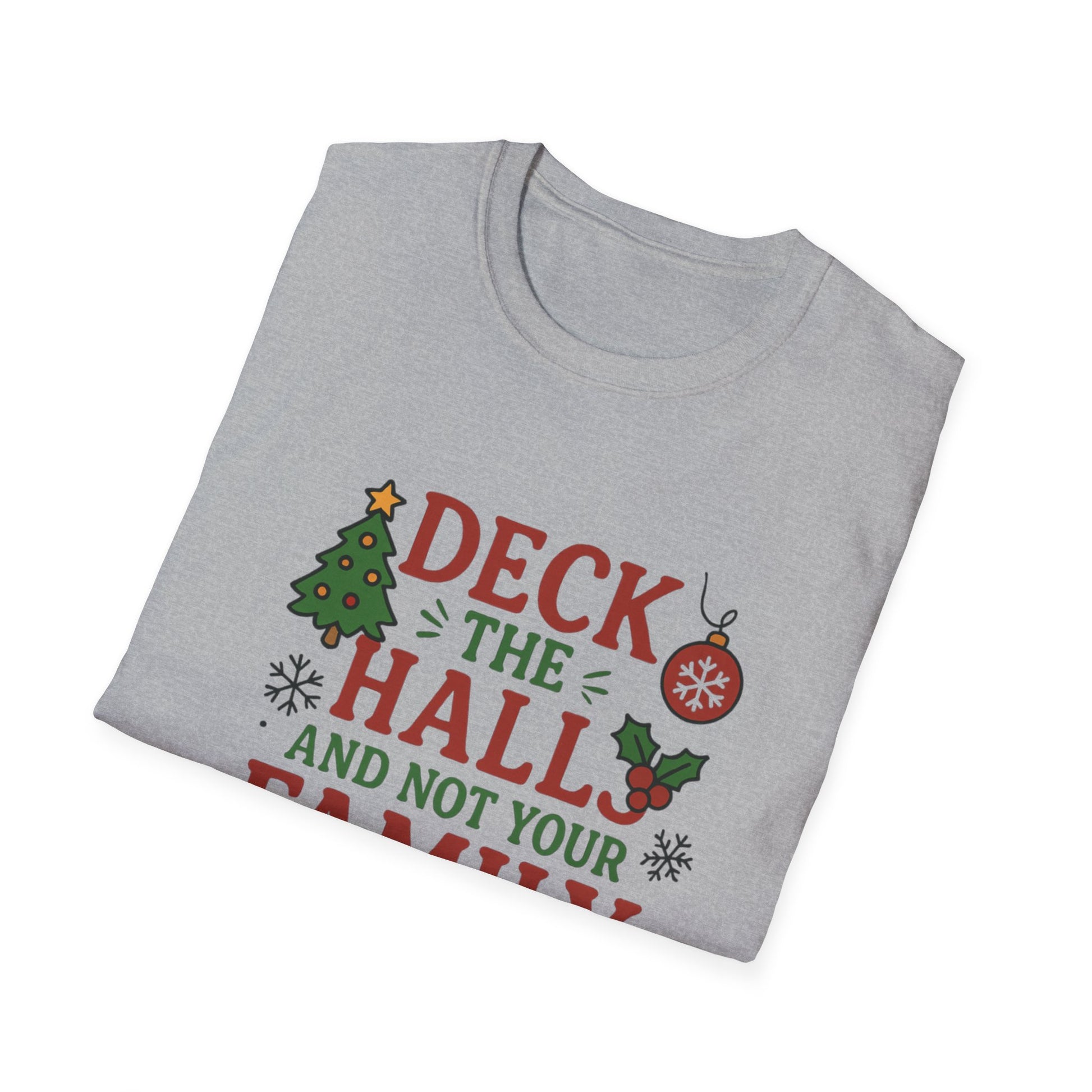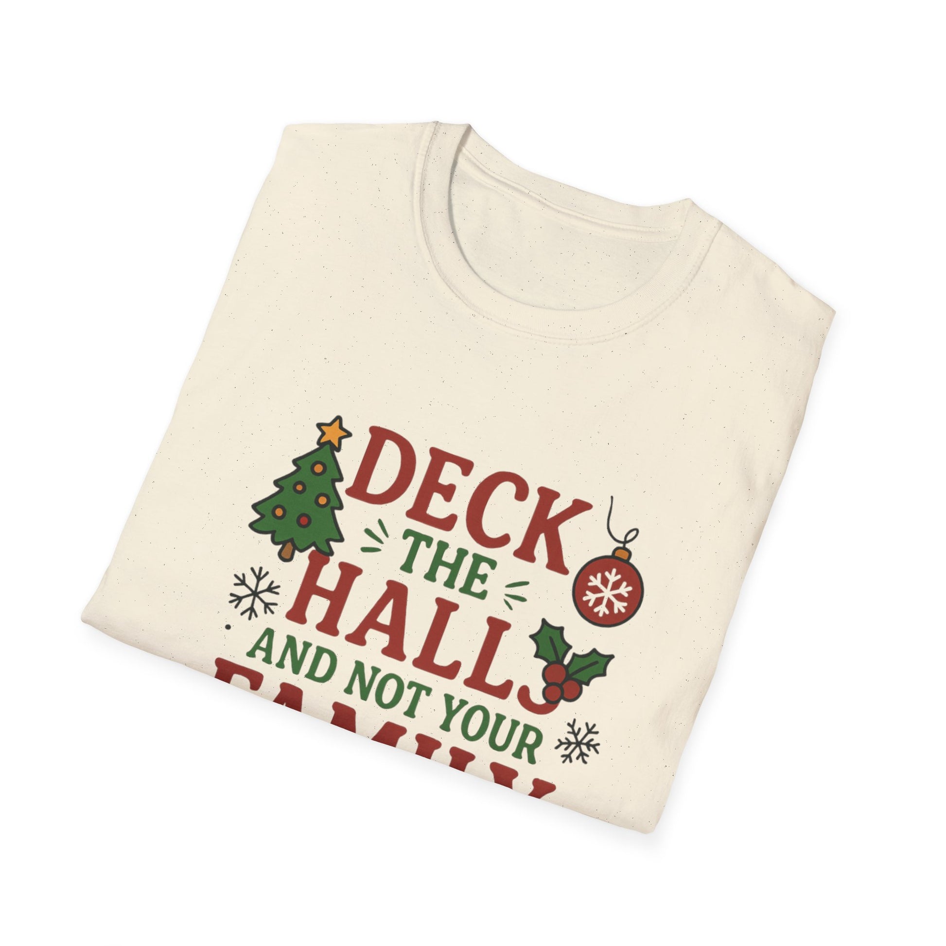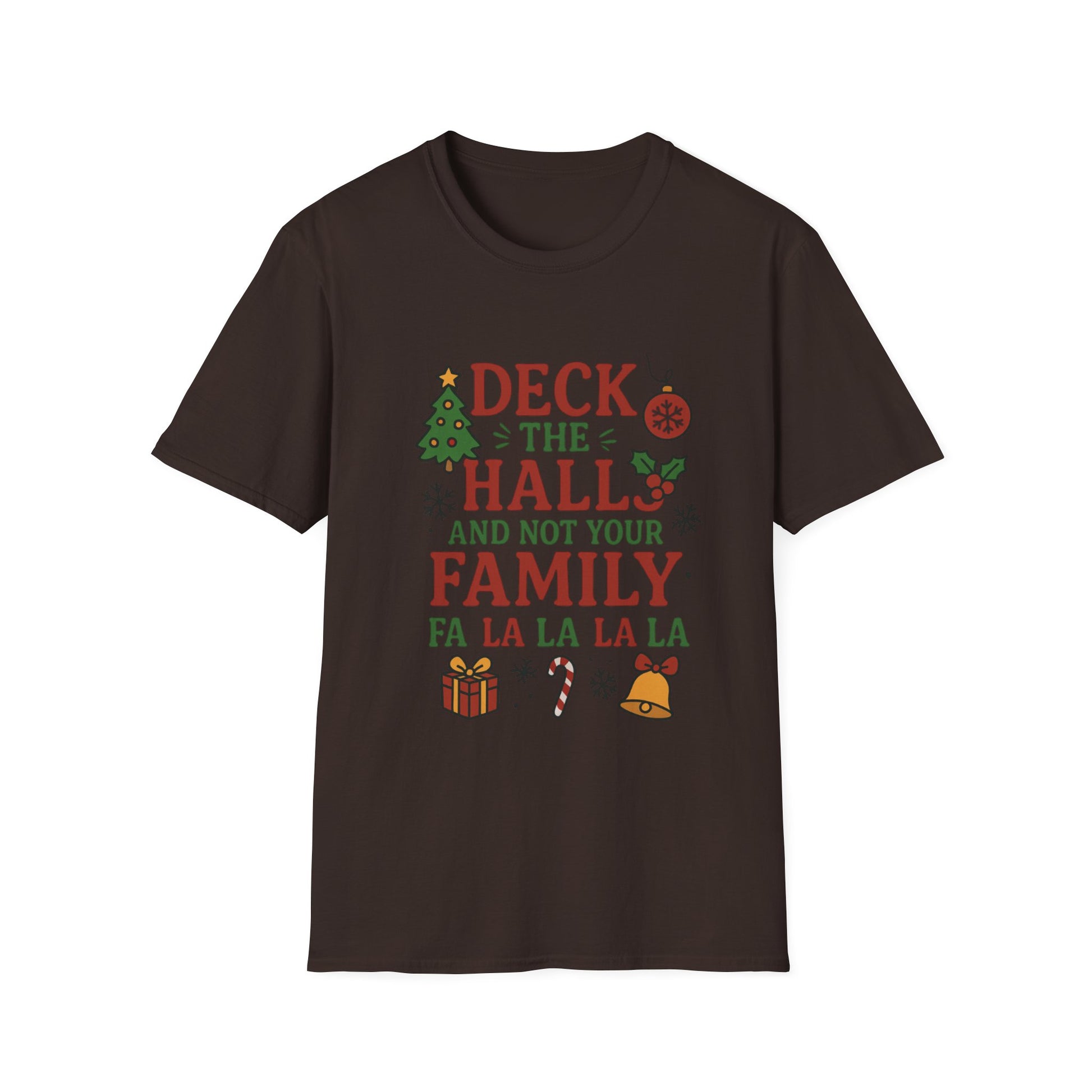 Embrace the holiday spirit with this Unisex Softstyle T-Shirt, perfect for festive gatherings or cozy family celebrations. Featuring a charming and humorous design that says, "Deck the Hall and Not Your Family, Fa La La La La," this shirt adds a light-hearted touch to your wardrobe. Made with 100% ring-spun cotton, it offers a soft and comfortable fit for all-day wear. Ideal for adults who love to spread cheer during the holidays, this shirt is a delightful addition to any Christmas or New Year’s Eve outfit. Celebrate in style at parties, family gatherings, and gift exchanges, making it a great gift for friends and family who appreciate a good laugh this season. Product features - Seamless design reducing fabric waste for a cleaner look. - Elastic ribbed collar that retains its shape. - Stabilized shoulder seams for added durability. - Crafted from ultra-soft, durable 100% ring-spun cotton. - Ethically produced, certified by Oeko-Tex for safety. Care instructions - Do not dryclean - Do not bleach - Tumble dry: low heat - Iron, steam or dry: low heat - Machine wash: cold (max 30C or 90F), with similar colors